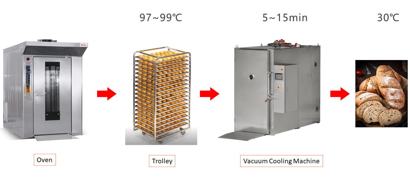 以VC10 型速冷机为例,100kg的面包从烤箱拉出后,直接推入真空速冷机,启动设备后仅需5分钟,温度即可降到38℃。