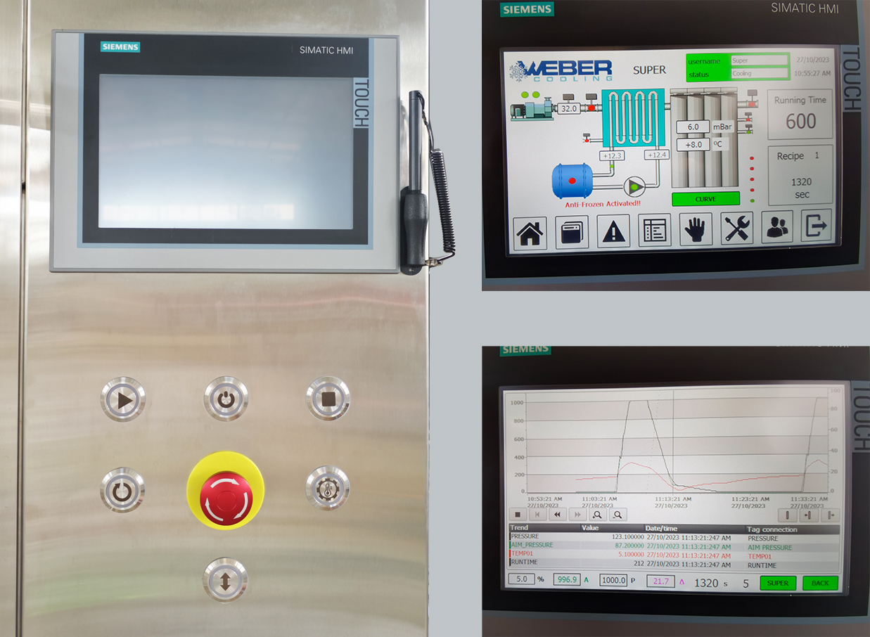 VC Compact系列真空速冷机采用西门子PLC和9寸触摸屏,配以Weber自主研发的控制系统,可根据需要设置运行参数,适用各种食品和菜品的降温要求。