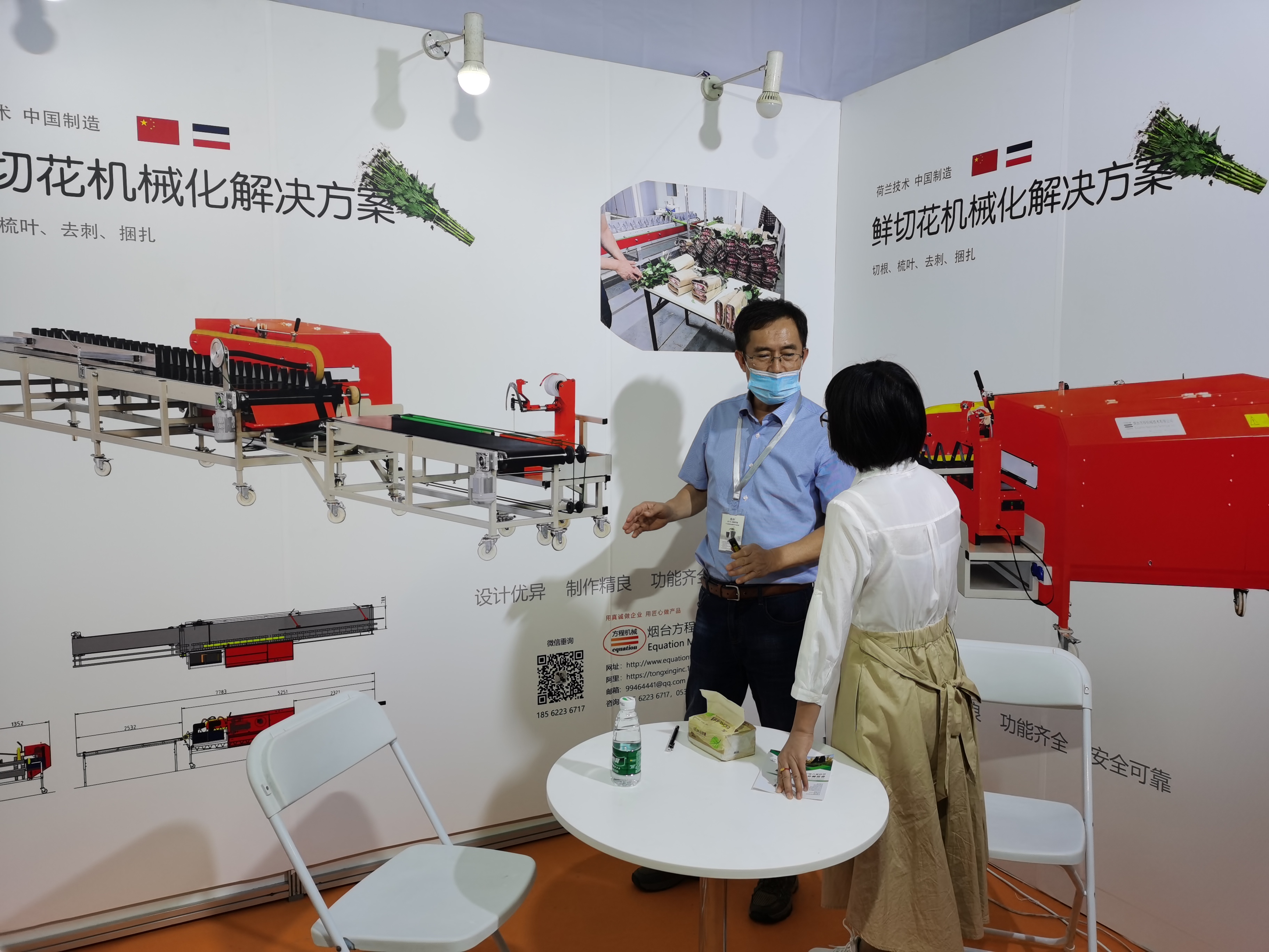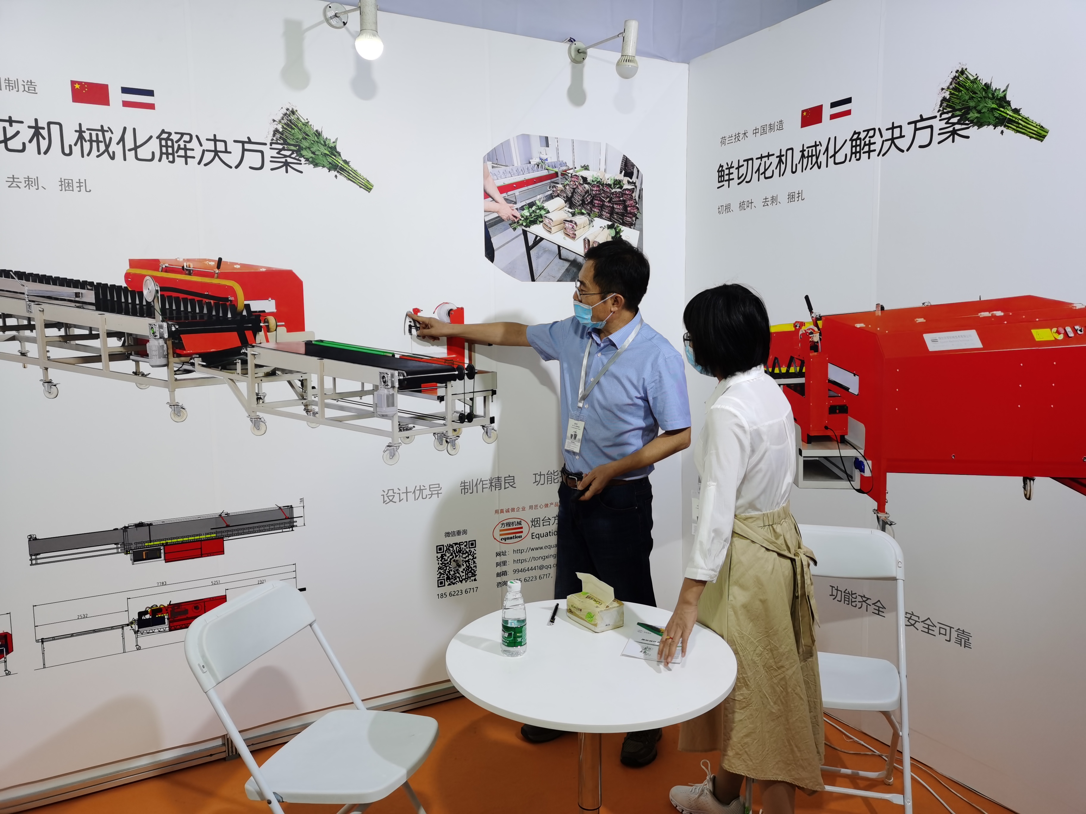 我公司参加了此次展会,在会上我们展示了鲜切花机械化解决方案和蔬菜流水捆扎机两个产品。鲜切花生产过程中切根、去叶、梳理、捆扎等工序全部实现了自动化生产,减少了人工,提高了效率,节约了成本;蔬菜流水捆扎机实现了商超、蔬菜生产企业等客户蔬菜捆扎全部自动化,得到了前来了解、洽谈的客户好评和认可。